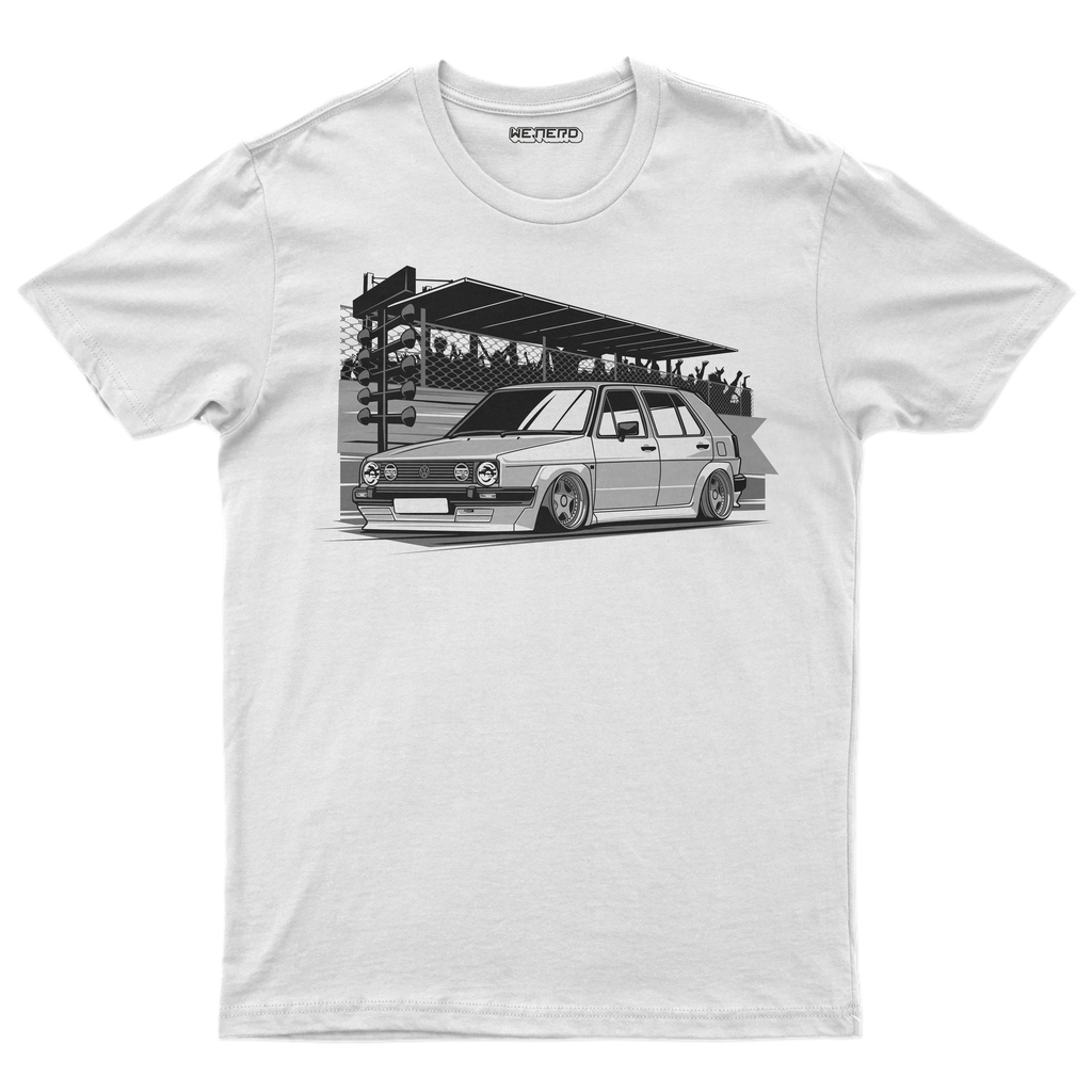 A Camiseta VW Drag Race homenageia a cultura dos rachas e a paixão pelos clássicos da Volkswagen. A estampa traz um VW Golf Mk2 estilizado em preto e branco, baixo e imponente, posicionado em uma pista de arrancada com a árvore de largada ao lado e arquibancadas cheias ao fundo. Um design que transmite velocidade, adrenalina e lifestyle automotivo raiz.