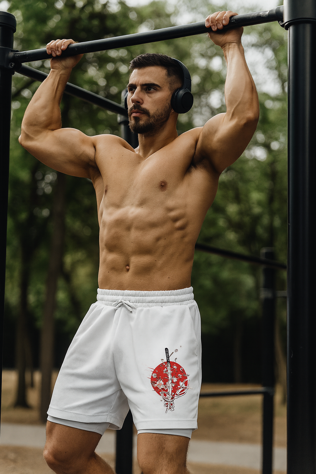 🔥 Por que esse design é especial? Porque une tradição oriental e modernidade urbana em uma única peça. A combinação do branco minimalista com o vermelho marcante e os elementos simbólicos faz do short muito mais que roupa esportiva: é um manifesto de força, honra e estilo.