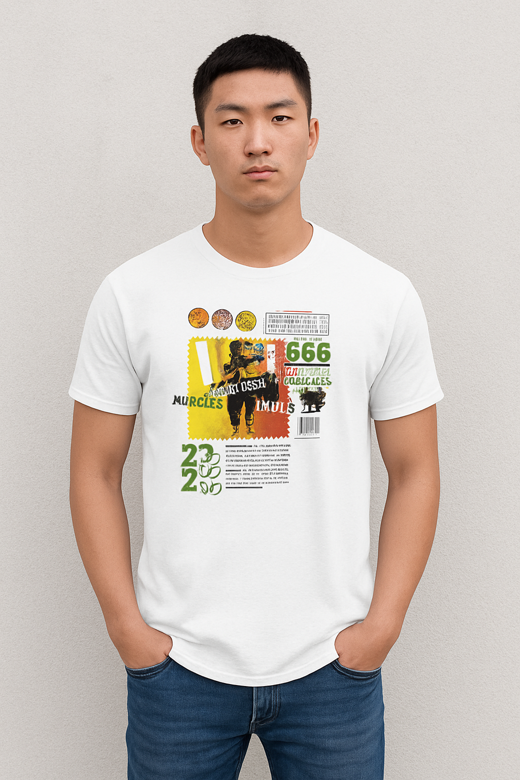 A sobreposição de elementos gráficos e tipográficos cria um visual impactante que lembra lambe-lambes e grafites urbanos. Mais do que roupa, é uma peça que transmite identidade e atitude.